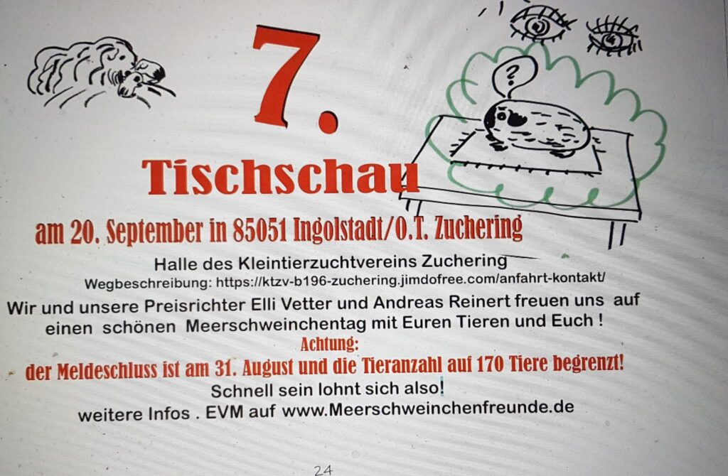 Bereits zum 7. mal findet am 20.09.2025 unsere Tischschau in Zuchering statt. Meldeschluss ist der 31.08.2025